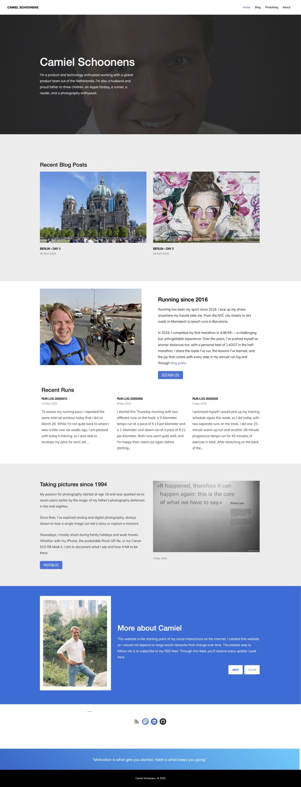 I updated this website last night and made some final CSS changes to the front page this morning. I’m happy with how things have turned out. As you can see, I decided to design the front page around the topics that matter most to me: Running and Photography.