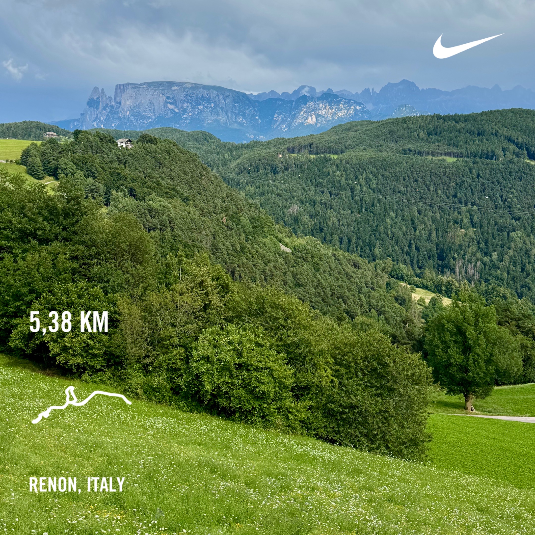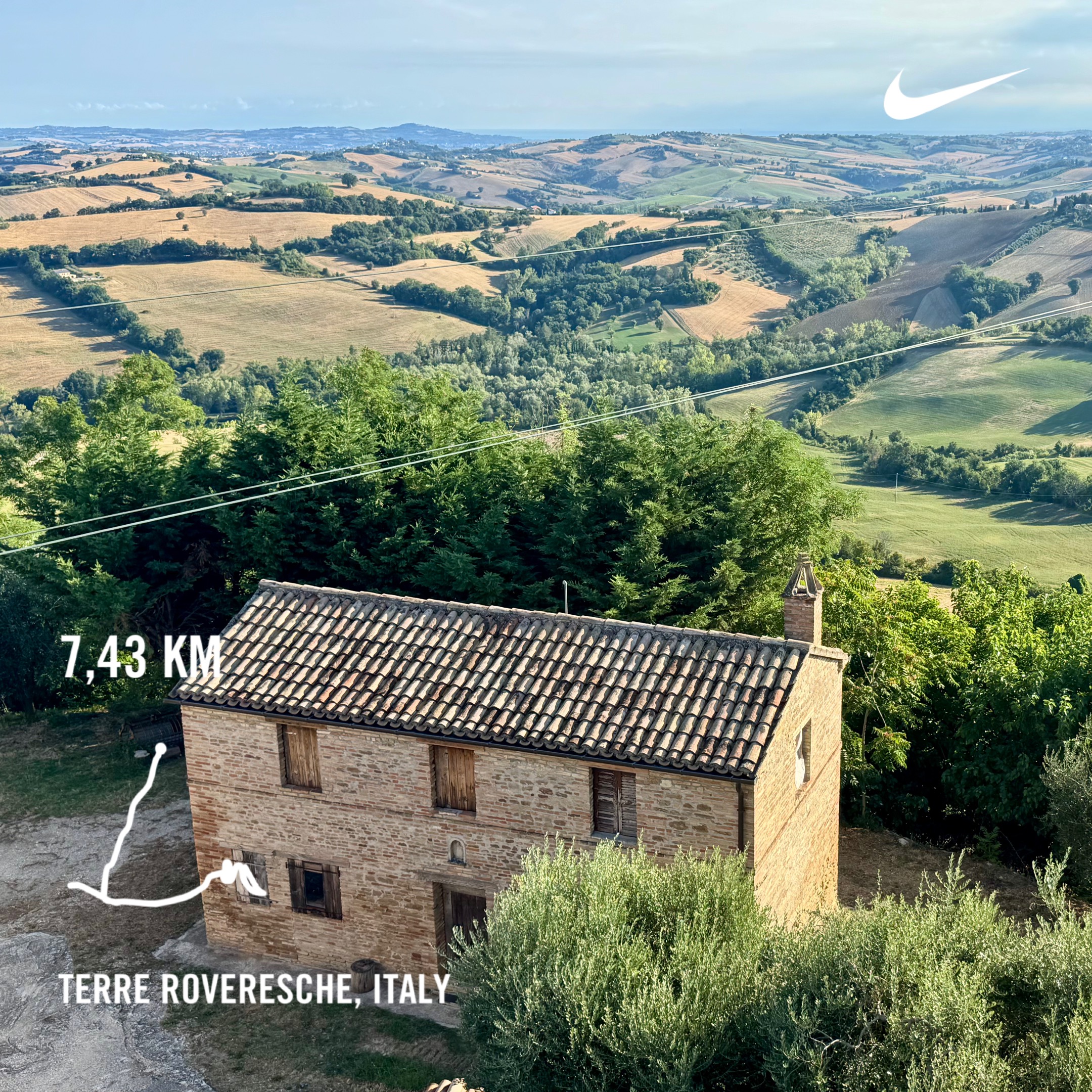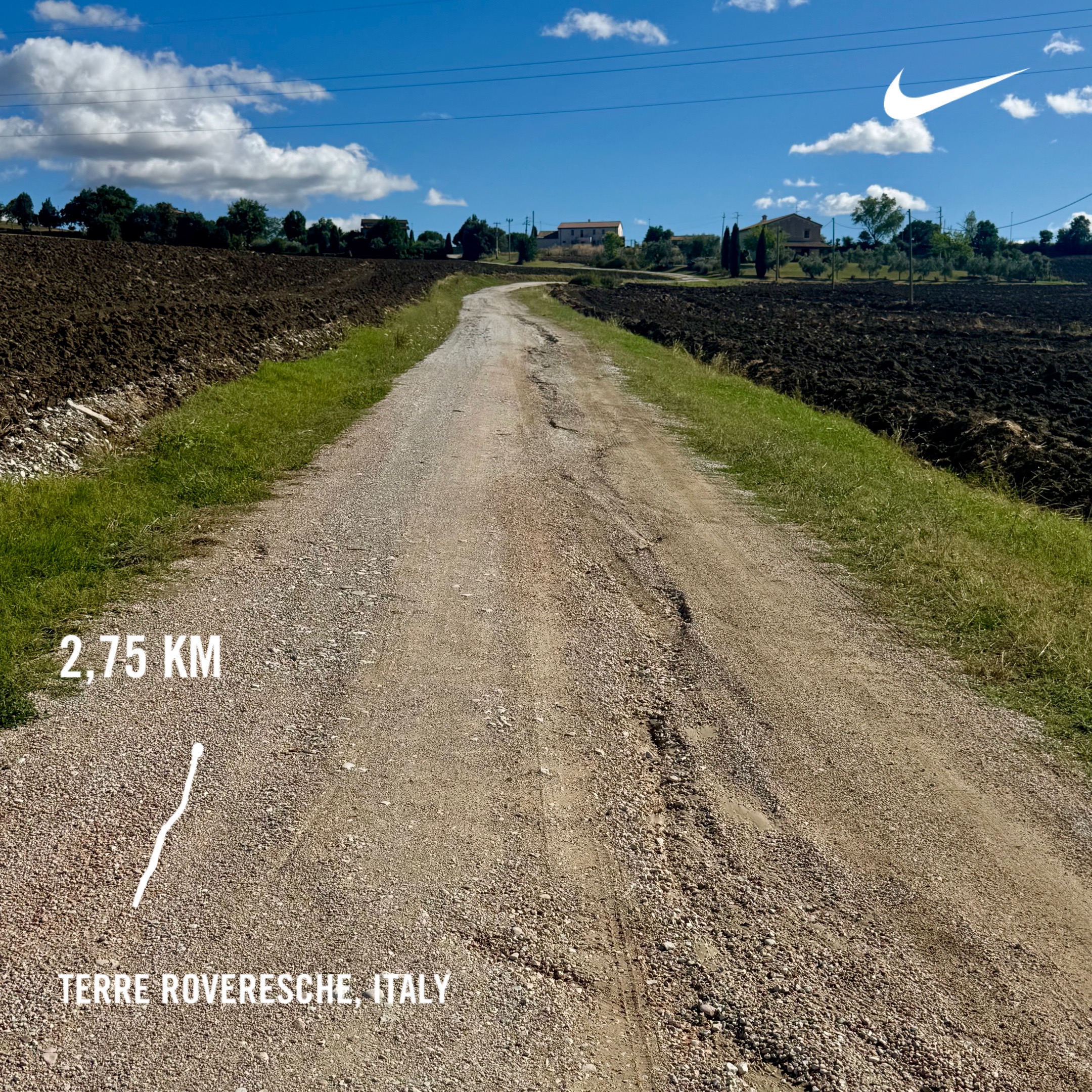 The Italian slope next to our agriturismo is perfect for a proper hill workout. I completed three sets of 60, 45, and 30-second intervals, with 120, 90, and 60 seconds of downhill recovery in between. This was a fun and challenging workout. The total distance measured is 2,75 kilometers of running up the hill, including a 5-minute warm-up and a 5-minute cool-down.