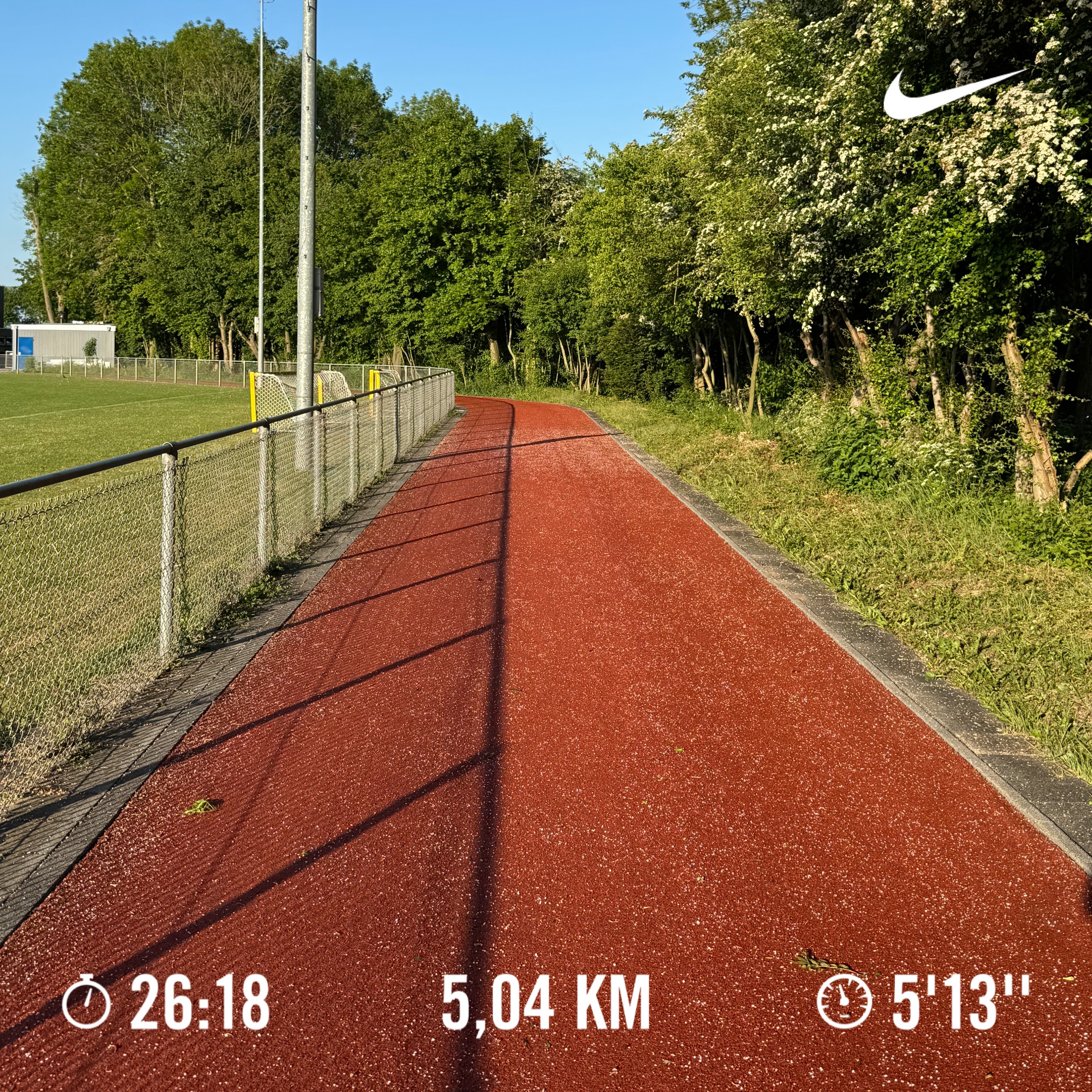 I started this Thursday morning with two different runs on the track: a 5-kilometer tempo run at a pace of 5:13 per kilometer and a 1-kilometer cool-down run at a pace of 6:21 per kilometer.